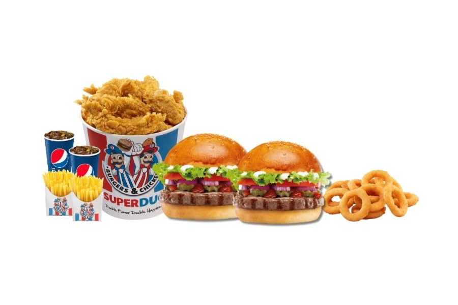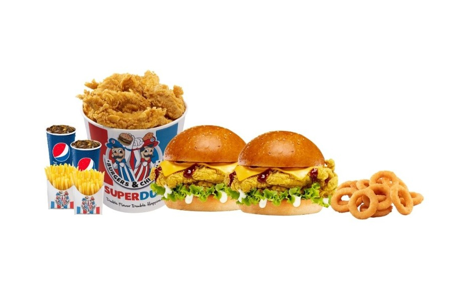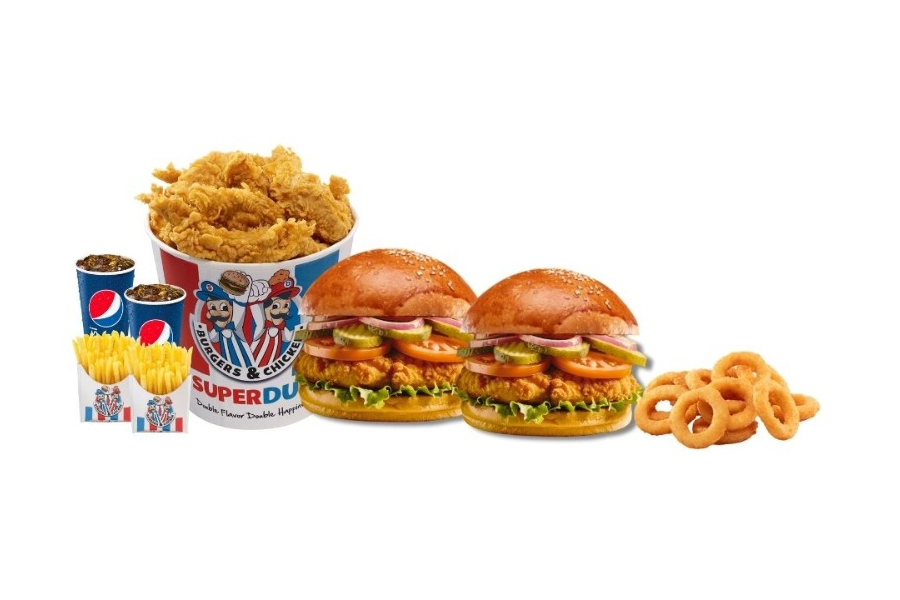 2 büyük boy Chicken Burger, 2 but, 8 hot shots, 2 kemiksiz çıtır, 4 kanat, 1 büyük boy patates, 2 sınırsız içecek, 6 soğan halkası (hediye)